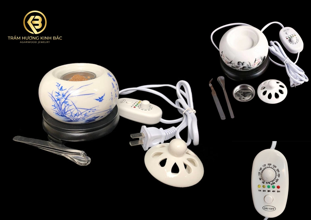 - Sản phẩm gồm:Thân lư. Nắp lư. Bộ điều khiển: Nút bật/tắt, có hẹn giờ từ 1 giờ- 5 giờ, điều chỉnh nhiệt độ từ 50 – 330 độ C. Bộ thìa và nhíp: Thìa để xúc bột trầm, nhíp để mở nắp lò lúc nóng hoặc gắp – trở trầm miếng.