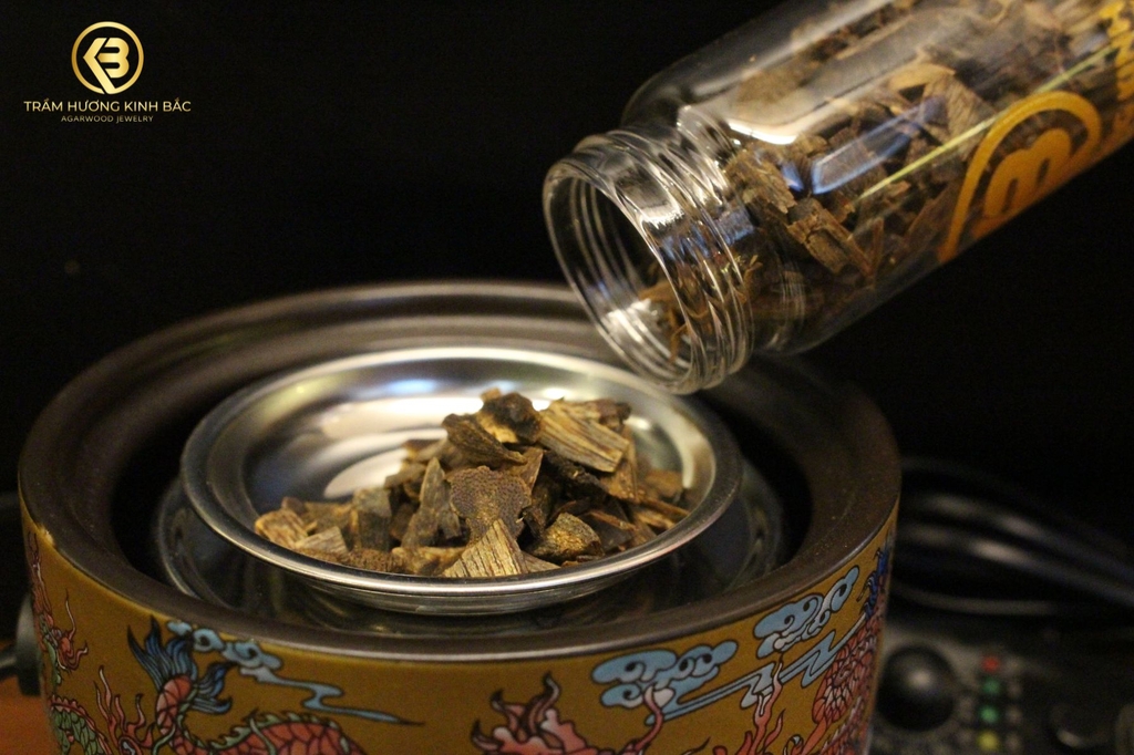 - Sử dụng nhíp để gắp vụn hoặc thìa để xúc bột trầm (hoàng đàn, ngọc am, các loại gỗ quý khác…) lên trên khay kim loại.