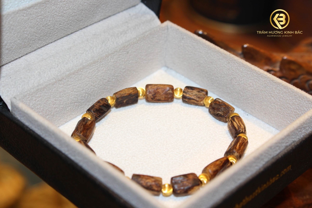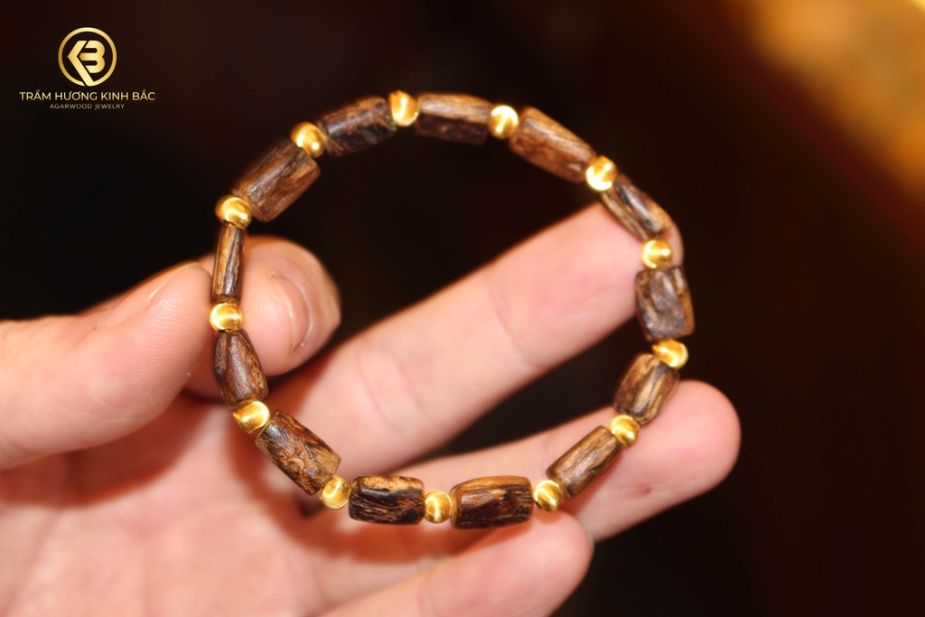 Vòng tay Trầm Hương được phối với bi vàng 9999 phong thủy là một sự cộng hưởng không thể nào hoàn hảo hơn, mang ý nghĩa chiêu sinh tài lộc, giữ của, không cho thất thoát.