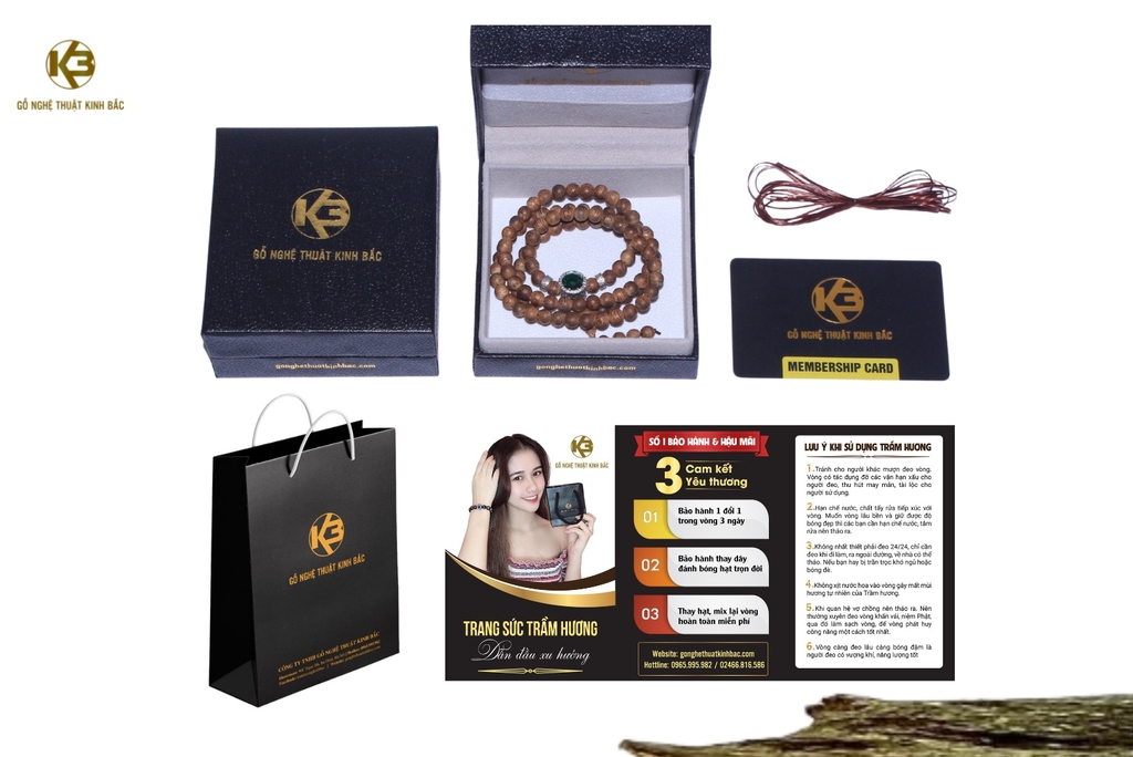 Sản phẩm vòng trầm hương đi kèm hộp,túi đựng sang trọng, phiếu bảo hành mùi trọn đời, hóa đơn với đầy đủ thông tin của cửa hàng,hướng đẫn sử dụng và dây xâu dự phòng đi kèm cho từng sản phẩm.