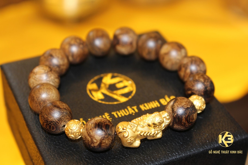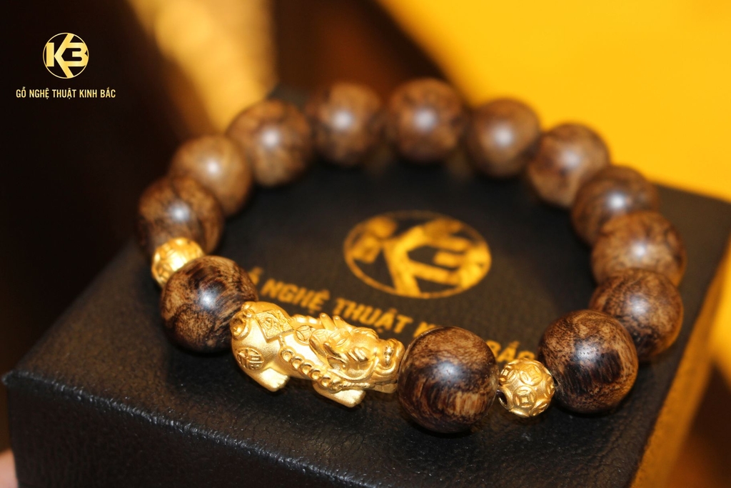 Vòng tay Trầm hương Tỳ Hưu Vàng đơn – Trầm Hương Philip 50 năm có Lượng tinh dầu nhiều – Mùi hương khác biệt không trùng lặp.